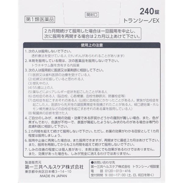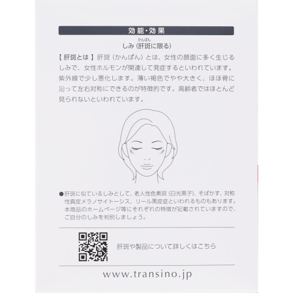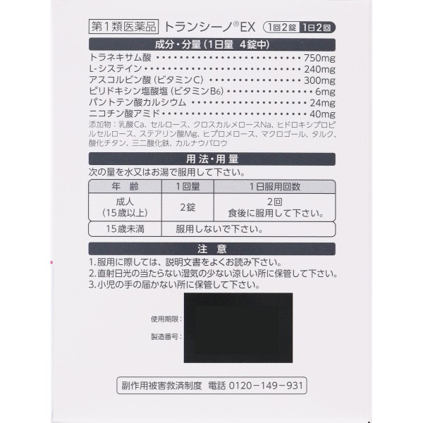 트란시노 EX는, 간반에 효과가 있는 트라넥삼산을 간반 개선 성분으로 배합한 1회 2정, 1일 2회 복용의 의약품입니다.