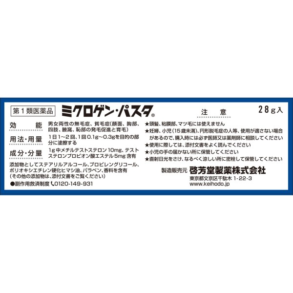 미크로겐·파스타는, 2종의 테스토스테론(남성호르몬)을 주성분으로 한, 흡수되기 쉬운 크림 형태의 외용 육모제로, 눈썹, 수염, 가슴 모, 겨드랑이, 성모 등 체모가 자라는 부분에 바르면, 발모 촉진, 육모 효과가 기대됩니다.