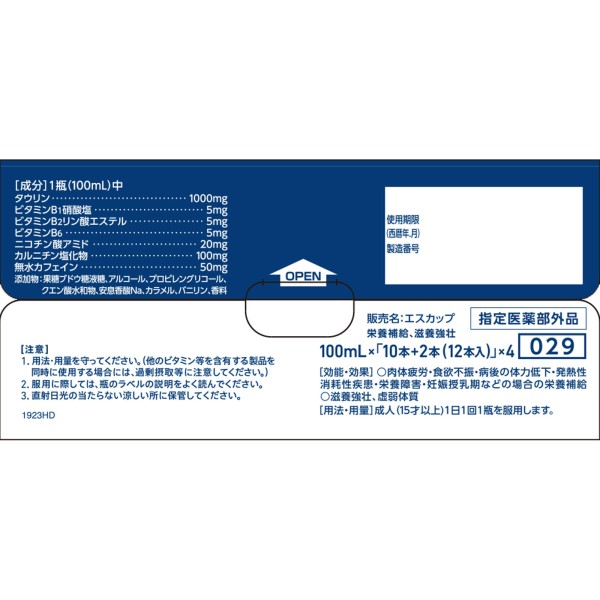 에스캅은, 식욕부진 시에 유용한 카르니틴염화물을 비롯하여, 육체피로 시에 부족하기 쉬운 비타민 B군이나 타우린을 배합한, 육체피로 시의 영양 보급이나 자양강장에 효과적인 드링크제입니다.
