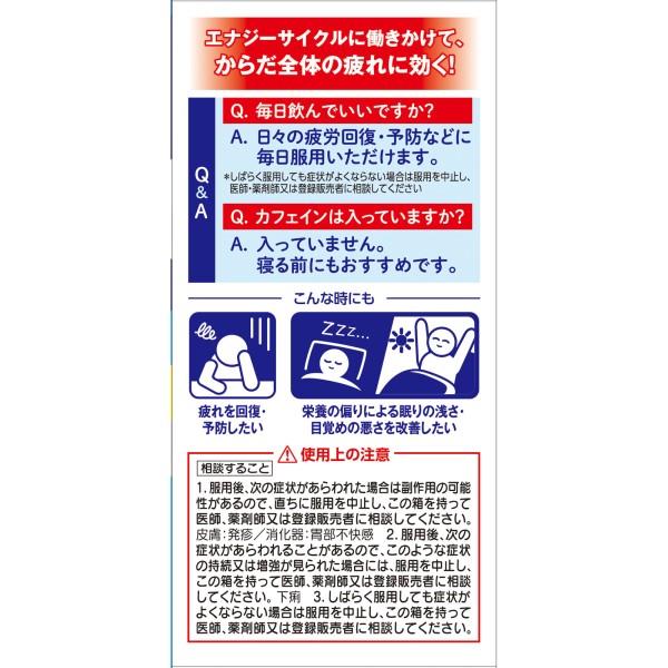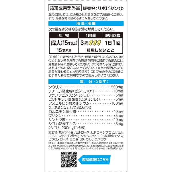 리포비탄 DX에는, 생활자의 피로에 함께해온 리포비탄 시리즈의 베이스 처방인 타우린, 비타민 B군(비타민 B1, B2, B6)에 비타민 C와 아미노산, 생약을 배합하고 있습니다.