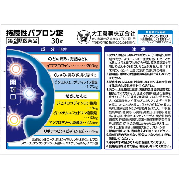 ·지속성 파브론정은, 해열진통【성분】이부프로펜, 기도점막 케어【성분】암브록솔염산염 등, 6종류의 유효 성분을 배합하여, 목 통증, 기침, 콧물, 발열 등 괴로운 감기의 11증상에 효과를 나타내는 감기약입니다.