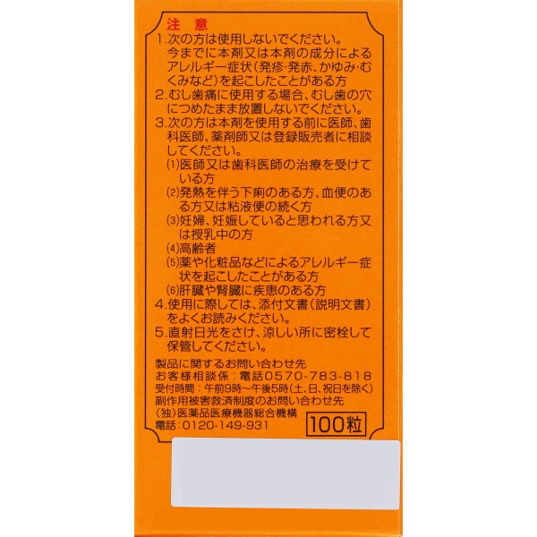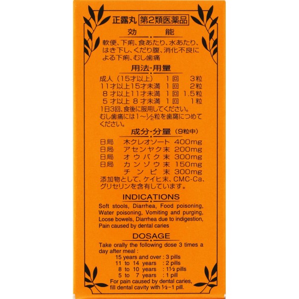 위장약 정로환은, 100년 이상 전부터, 가족(5세 이상) 여러분에게 사용되고 있는 상비약입니다. 천연 성분의 일본약국방(일국) 목크레오소트는 장의 운동을 멈추지 않고, 장내의 수분 밸런스를 조정하여, 배에 작용합니다. 특히 식중독, 물갈이, 소화불량 등의 음식물, 음료가 원인으로 일어나는 연변, 설사 및 스트레스, 감기 등의 원인으로 일어나는 연변, 설사에 뛰어난 효과를 발휘합니다. 본제는 주성분 일국 목크레오소트를 비롯하여 아센야쿠말, 오우바쿠말, 감초말 및 진피말 등의 생약을 배합한 특유의 냄새를 가진 약간 축축한 부드러운 환제입니다.