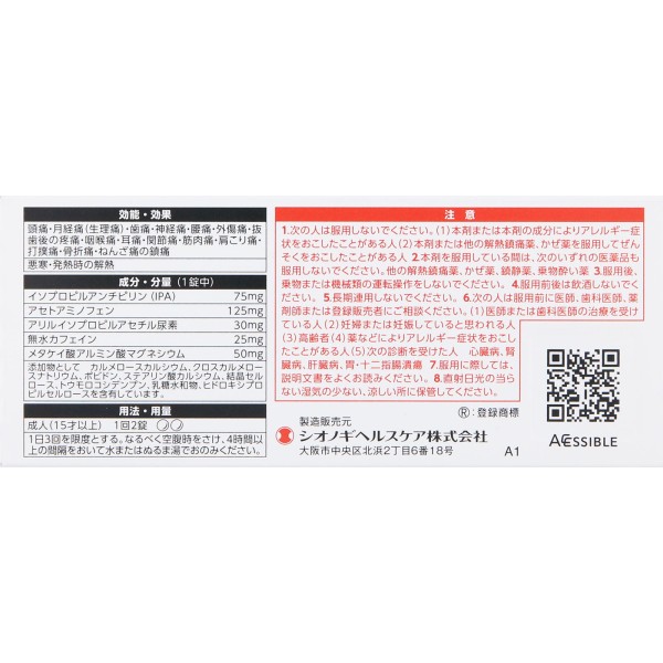 ●진통 작용이 강한 이소프로필안티피린을 비롯한 4종류(이소프로필안티피린, 아세트아미노펜, 알릴이소프로필아세틸요소, 무수카페인)의 성분을 배합하여, 강한 통증에도 뛰어난 진통 효과를 나타냅니다.