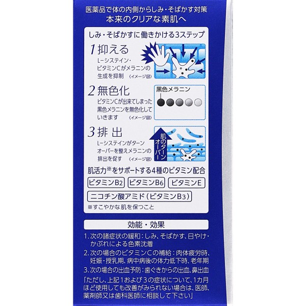 ●L-시스테인이 비타민 C와 협력하여, 기미와 주근깨의 원인이 되는 멜라닌의 생성을 억제. 게다가 피부의 신진대사를 촉진하고 멜라닌의 배출을 촉진하여 기미, 주근깨나 햇빛 타기에 의한 색소 침착을 완화합니다.