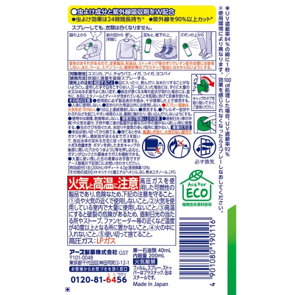 옷 위에서 사라텍트 모기 방충 스프레이 아웃도어 캠핑 공원 외출 해충 대책 UV컷 200ml 아스제약 > 가스 스프레이