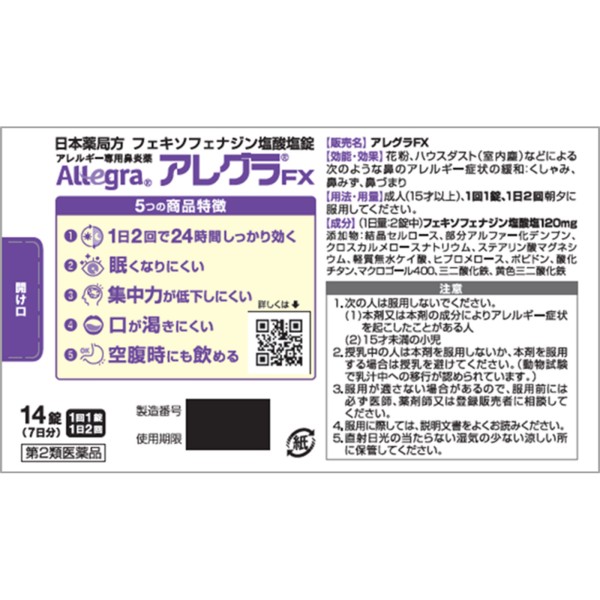 알레그라 FX 14정 히사미츠제약 > 항알레르기약 (1일 2회)