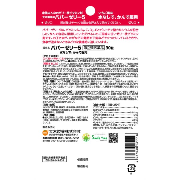 파파젤리 5는, 비타민 A, B6, C, D2, E와 판토텐산칼슘을 배합한, 씹어서 용이하게 복용하실 수 있는 딸기 풍미의 달콤한 젤리 형태 비타민제입니다.