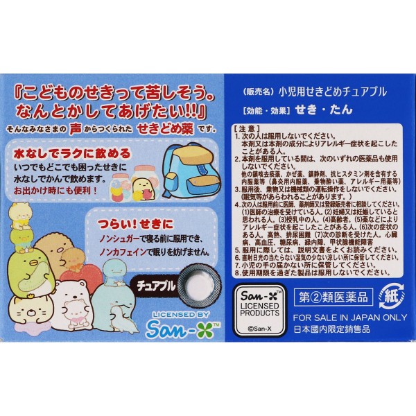 ○소아용 기침멈춤 츄어블은, 물 없이 씹어 먹을 수 있는 약으로, 신경 쓰이는 기침을 진정시킵니다.