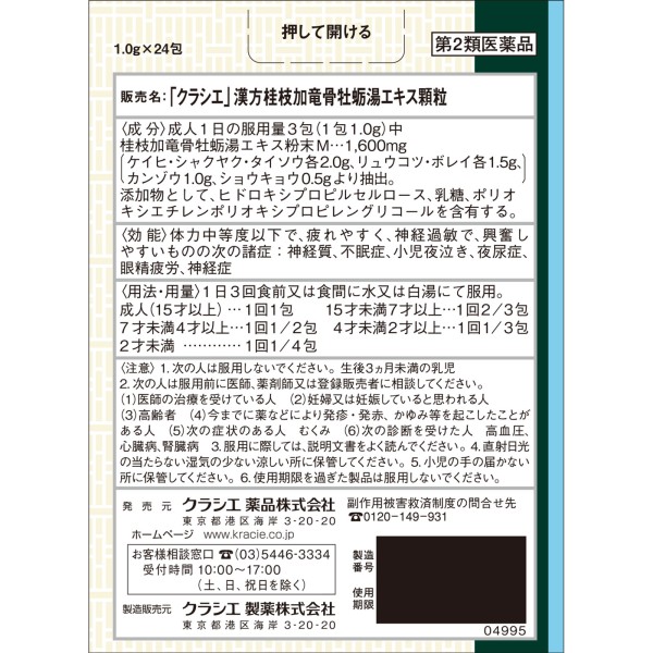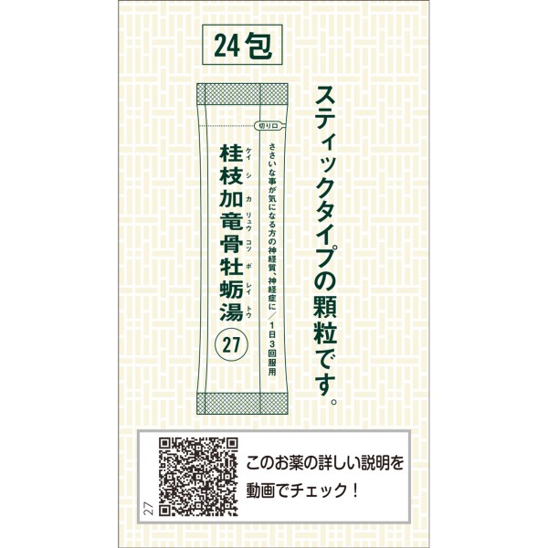 ●'계지가용골모려탕'은, 한방의 고전이라 불리는 중국의 의서 '금궤요략'에 수재되어 있는 약방입니다. 평소 손바닥이 축축한 신경질 타입으로, 손발이 나른하고 지치기 쉬운, 머리가 상열감이 있고 잠들 수 없고 가슴이나 복부의 심계항진을 스스로 느끼는, 기분이 우울하고 건망증이 심하고, 사소한 일에도 흥분하기 쉬운 증상이 있는 경우에 사용됩니다.