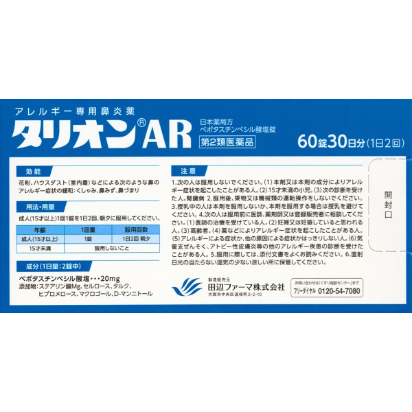 타리온AR 60정 타나베파마 > 항알레르기약 (1일 2회)