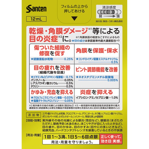 손상된 조직 수복을 촉진하는 황산아연 수화물, 각막에 윤기를 주어 보호하는 콘드로이틴 황산에스테르나트륨을 비롯한 6가지 유효 성분을 승인 기준 내 최대 농도로 배합하고, 총 10종의 유효 성분을 배합. 각막 손상을 수복·보호하여 눈의 염증 등 눈 트러블에 효과를 발휘하는 안약입니다.