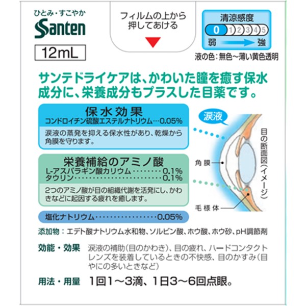 산테 드라이케어에는 눈 건조함 등을 치유하기 위한 3가지 유효 성분이 배합되어 있습니다. 배합 성분 중 하나인 콘드로이틴 황산에스테르나트륨은 눈 표면의 수분을 머물게 하고 보수하는 작용이 있습니다. 타우린과 L-아스파라긴산칼륨은 눈 조직에 영양을 공급하고 대사를 활발하게 합니다.