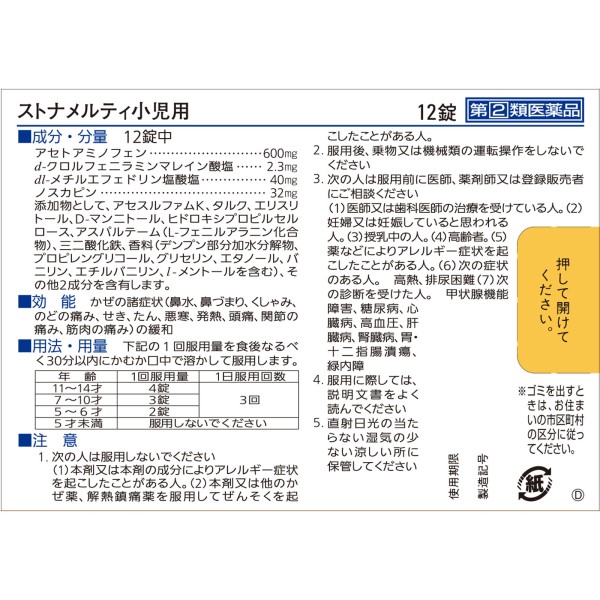 스토나멜티 소아용 12정 사토제약 > 소아용 종합 감기약(분제·과립·정제)