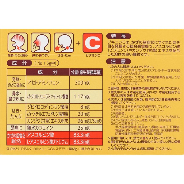 지키닌C는 진해제 디히드로코데인인산염이나 해열진통제 아세트아미노펜, 진해·거담 작용이 있는 생약 감초 엑기스, 감기로 소모되기 쉬운 아스코르브산(비타민C) 등을 배합한, 감기에 의한 두통, 발열, 목 통증 등에 잘 듣는 종합감기약입니다.