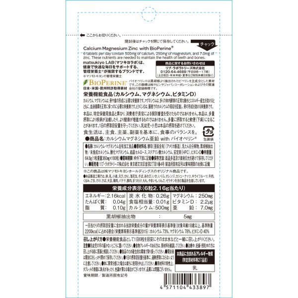 마츠키요 LAB 칼슘마그네슘아연 with 바이오페린 180립 > 칼슘제