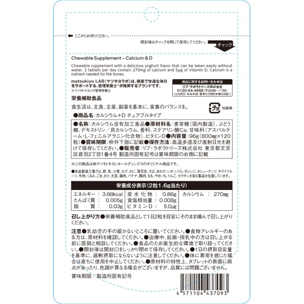 마츠키요 LAB 먹는 보충제 칼슘+D 츄어블 타입 120알 > 칼슘제