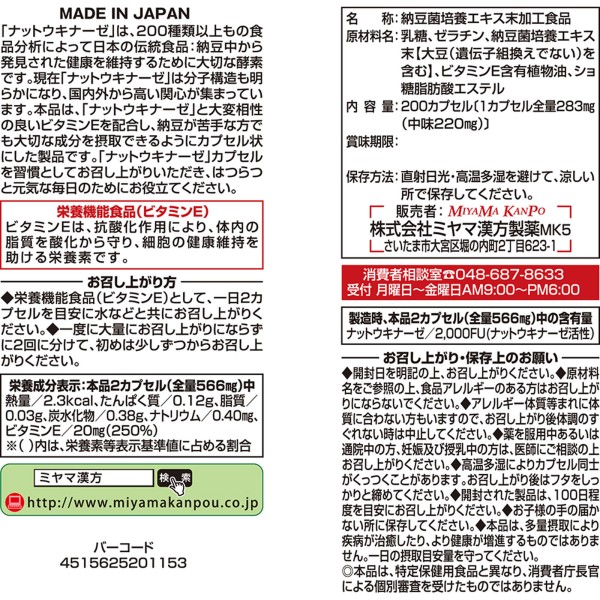 MK 낫토키나제 납두균 배양 에키스 200구 미야마 칸포제약 > 낫토