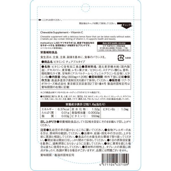 마츠키요 LAB 먹는 보충제 비타민 C 츄어블 타입 120알 > 비타민C제