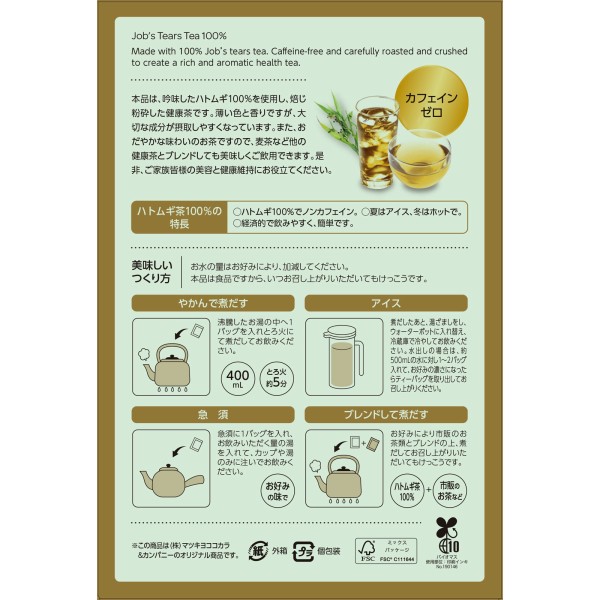 율무를 100% 사용했습니다. 논카페인으로, 정성스럽게 배전·분쇄한 깊은 맛과 향기가 뛰어난 건강차입니다.