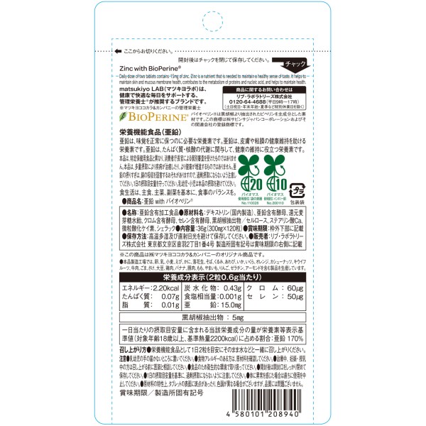 마츠키요 LAB 아연 with 바이오페린 대용량 120알 > 철제