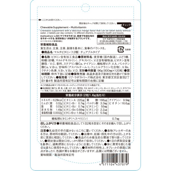 마츠키요 LAB 먹는 보충제 멀티비타민 츄어블 타입 120알 > 종합 비타민제