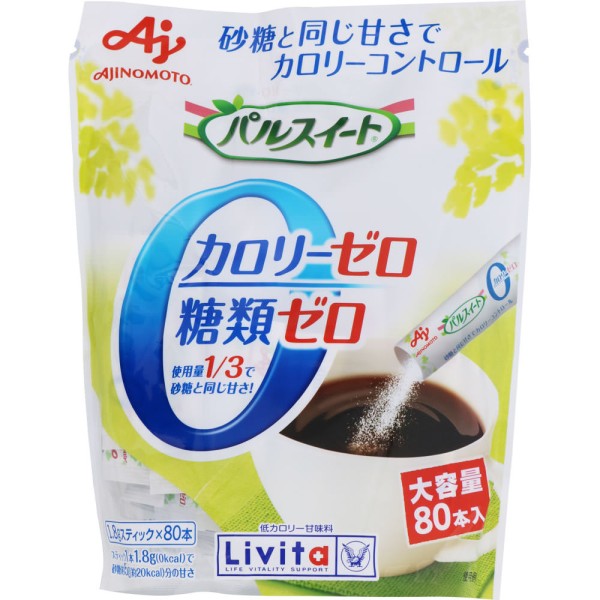 매일의 식사·칼로리 섭취가 신경 쓰이는 분에게. 야채나 과일에도 포함된 아미노산에서 저칼로리 감미료. 칼로리 제로, 당류 제로, 사용량 1/3로 설탕과 같은 단맛! 깔끔한 단맛. 대용량 팔스위트 칼로리 제로는 식사를 관리하고 칼로리 섭취를 줄이는 분에게 적합한 칼로리 제로·당류 제로 감미료입니다. ○단맛 기준: 1포(1.8g)로 티스푼 약 2스푼(약 5g)분의 설탕 단맛입니다. (동일 단맛) 팔스위트 칼로리 제로 스틱 1포 0kcal / 설탕 티스푼 2스푼 약 19kcal