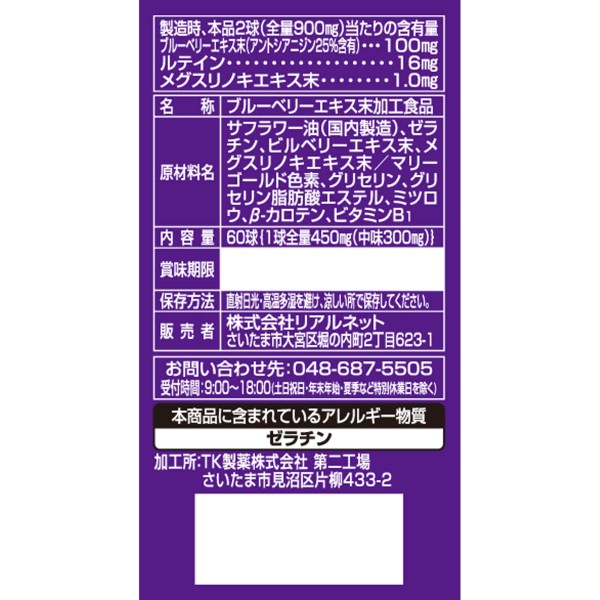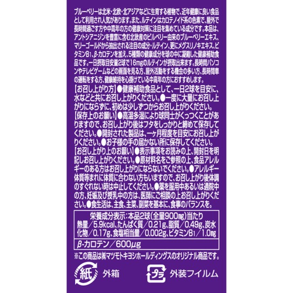 안토시아니딘이 풍부한 빌베리 유래 블루베리 엑기스, 메리골드에서 추출되는 주목의 성분 루테인, 그리고 메구스리노키 엑기스, 비타민B1, 베타카로틴을 소프트 캡슐에 응축했습니다.