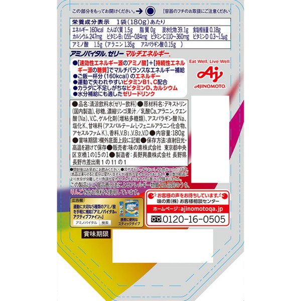 에너지원이 되는 아미노산 1500mg, 운동으로 손실되기 쉬운 비타민B1, 비타민C, 몸에 부족하기 쉬운 비타민D, 칼슘, 밥 1공기 상당의 에너지 160kcal을 배합한, 효율적이고 균형 잡힌 영양보급을 서포트하는 젤리 드링크입니다.