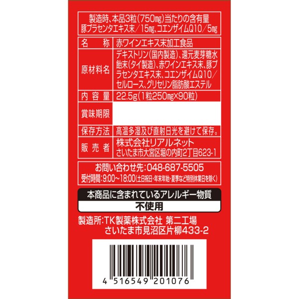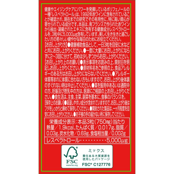 ○본 제품은 남프랑스 론 계곡에서 만들어진 적포도주에서 추출·농축한 엑기스에 함유된 건강 성분 레스베라트롤을 3알 중 5000μg 함유하고 있습니다. 아름답고 생기 있게 지내고 싶은 분의 젊고 건강한 매일을 위해 활용해 주세요.