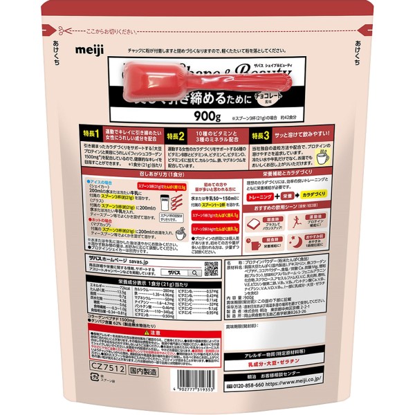 탄탄한 몸 만들기를 서포트하는 「대두 프로틴」과 미용에 반가운 「피시 콜라겐 1500mg」을 배합하여, 건강한 아름다움을 목표할 수 있습니다 / 운동하는 여성의 몸 만들기를 서포트하는 6종의 비타민B군, 비타민A, 비타민C, 비타민D, 비타민E에 더해 칼슘, 철, 마그네슘 배합 / 당사 독자 조립 기술을 추구하여 잘 녹는 파우더이므로 셰이커뿐 아니라 컵으로도 간단히 물에 녹여 마실 수 있습니다 / 대두의 고소함이 느껴지는 깔끔한 단맛의 마시기 쉬운 초콜릿 풍미. 우유로 녹이면 부드러운 밀크 쇼콜라처럼 드실 수 있습니다.