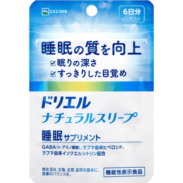 드리엘 내추럴 슬립은 아미노산 GABA와 천연 허브 '라프마'의 잎에서 추출한 성분인 히페로시드, 이소쿼시트린을 배합한 수면의 질을 높이는 기능성 표시 식품입니다.