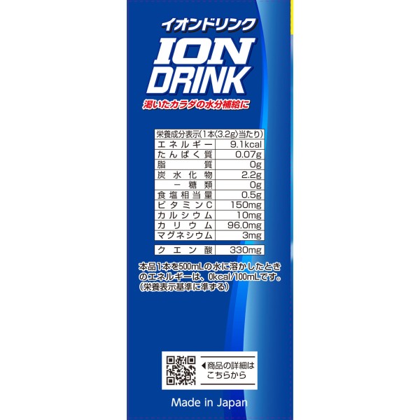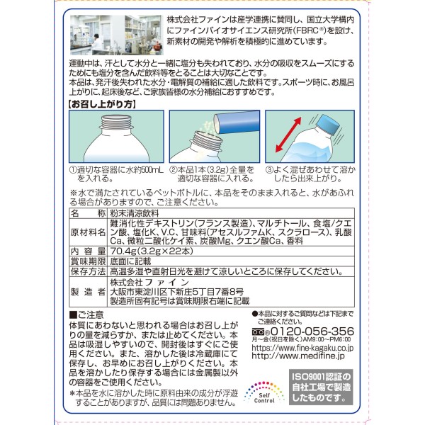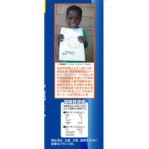 대량의 발한 등으로 손실되는 수분과 미네랄을 효율적으로 보충하기 위한 기능성 음료입니다. 발열 시에, 스포츠 시에, 목욕 후에, 기상 후 등에 추천합니다. 설탕, 지질, 보존료·착색료 제로입니다.
