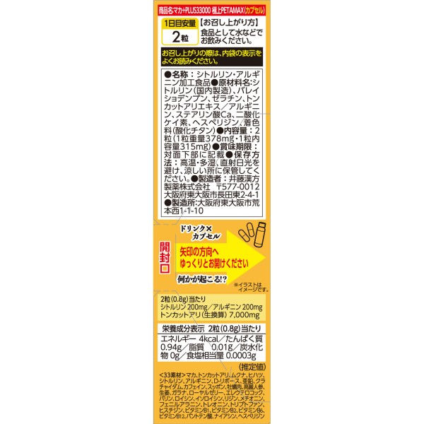 ドリンクには1本にマカMAXドリンクシリーズ最大級のマカ配合量24000MG(生換算)に加え、ムクナ1600MG(生換算)、同梱のカプセル(2粒)にトンカットアリ7000MG(生換算)、シトルリン200MG、アルギニン200MGを贅沢に配合しました。