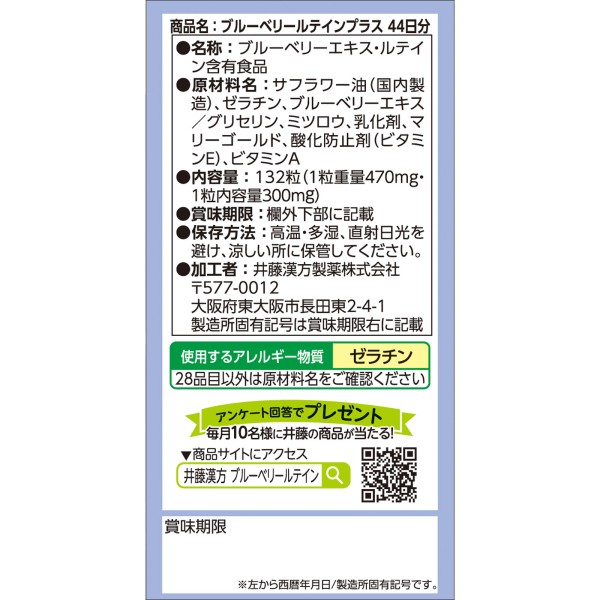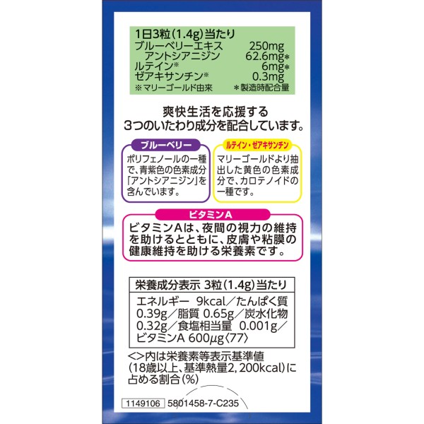 ブルーベリーエキス(北欧産ビルベリーのエキス)250mg、ルテイン6mg、ビタミンA600μg配合(1日当たり)。