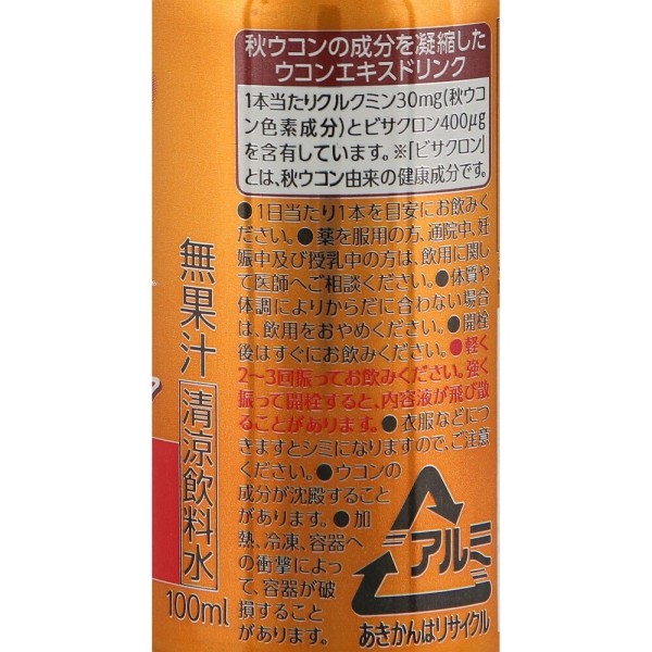 クルクミン30mg(秋ウコン色素成分)と秋ウコン由来の健康成分ビサクロン400μg、ビタミンB群4種を配合したウコンエキスドリンクなので、忙しい方の今日と明日の元気をおいしくサポート致します。