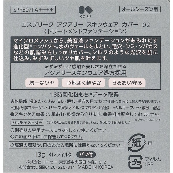 에스프리크 아쿠아리 스킨웨어 커버 02 내추럴베이지 13g 코세 > 파운데이션 (BB)