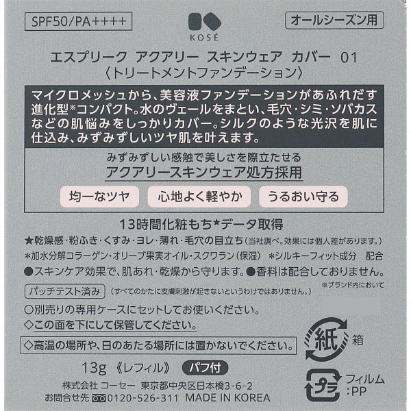 에스프릭 아쿠아리 스킨웨어 커버 01 라이트 베이지 13g 코세 > 파운데이션 (BB)