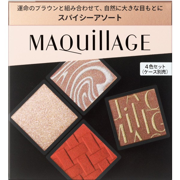 瞳色になじむ運命のブラウンと、好きな色を自由に組み合わせて、自然に大きく印象的な目もとへ。肌の美しさ・透明感まで引き出す4色のアイカラーセット。別売りの「マキアージュカスタマイズケース」にセットしてお使いください。お好みのカスタマイズシリーズを組み合わせて、お使いいただくこともできます。01スパイシーアソート