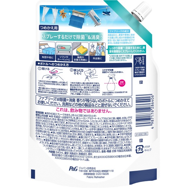 48時間爽やか続く*消臭 除菌*1 シワ取り*2。スプレーするだけで除菌*1 消臭。ファブリーズの成分:消臭成分と、野菜や果物に含まれる酸と同じ成分の除菌成分を配合。肌に触れる衣類やお子さまのいる家庭での使用もOK。布団や枕にソファやカーペットに梅雨や衣替え時期に外出後に*消臭効果による。新たに付着するニオイを除去するわけではありません。*1 特定の菌・条件下で試験。全ての菌に同様の効果が得られるものではありません。*2 コットン類で製品不使用時との比較で検証。効果は衣類の素材と使用状況によって異なる場合があります。使用方法:1か所につき2回スプレー後、生地を引っ張って伸ばす。