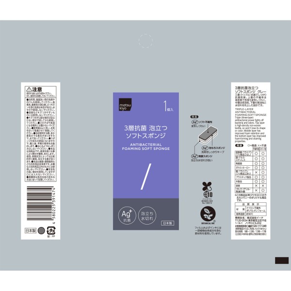 3層トリプル抗菌で清潔。無膜スポンジ採用で上部かつ抜群の泡立ちと素早い水切れのソフトスポンジです。グレー色。