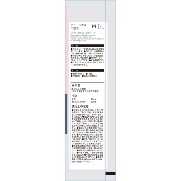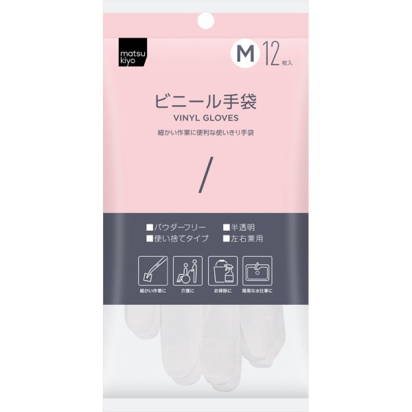 塩化ビニール製使いきり手袋12枚入Mサイズ。洗剤や油に対して耐久性があります。細かい作業に適しています。