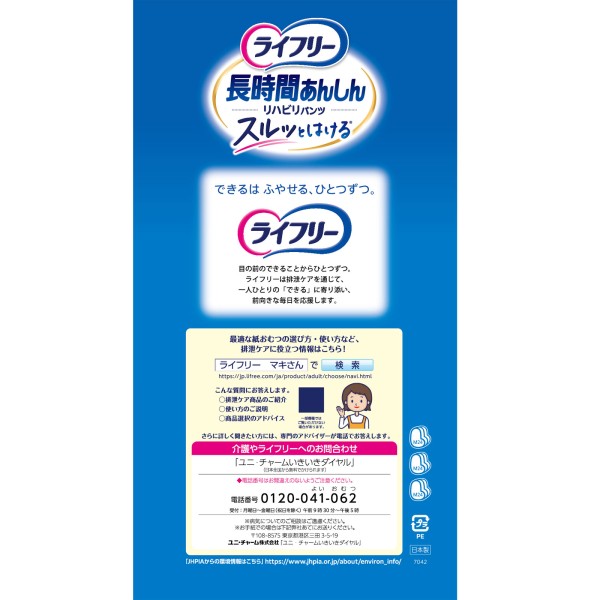 「ライフリーリハビリパンツM」は、介助があれば立てる方のための、長時間モレずに安心で上げ下げしやすい、排泄リハビリに最適な紙パンツです。
