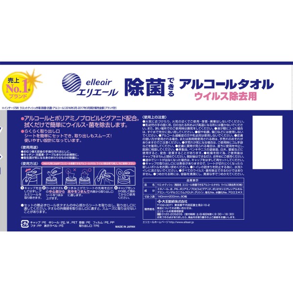 엘리에르 제균 알코올 타올 바이러스 제거용 본체 80매 보틀 다이오제지 > 제균