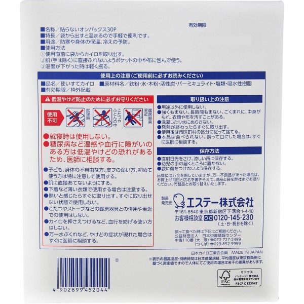 붙이지 않는 온팩스 30개 에스테 PB > 레귤러 손난로