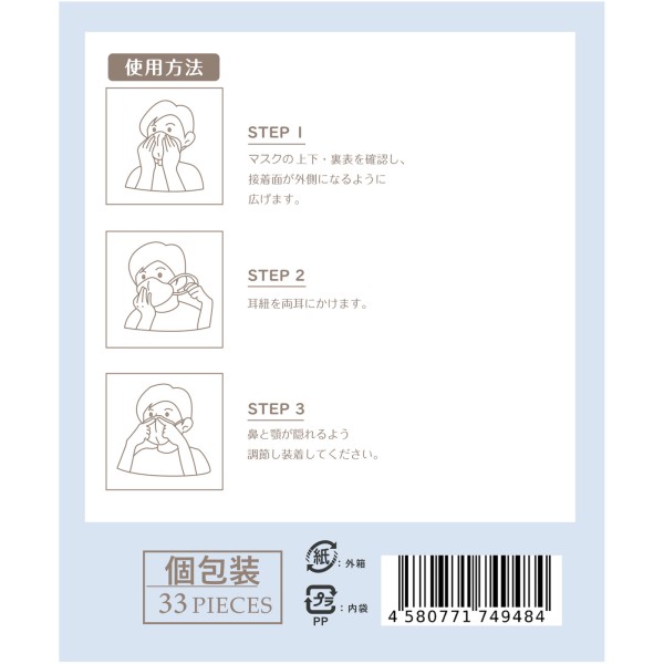 鼻が痛くなりにくい1枚成形の3Dデザイン。幅の広い柔らか耳紐を採用。