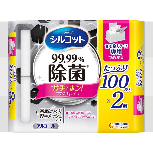대용량 실코트 99.99% 제균 웨트 티슈 알코올 타입 리필 100매×2 유니참 > 제균