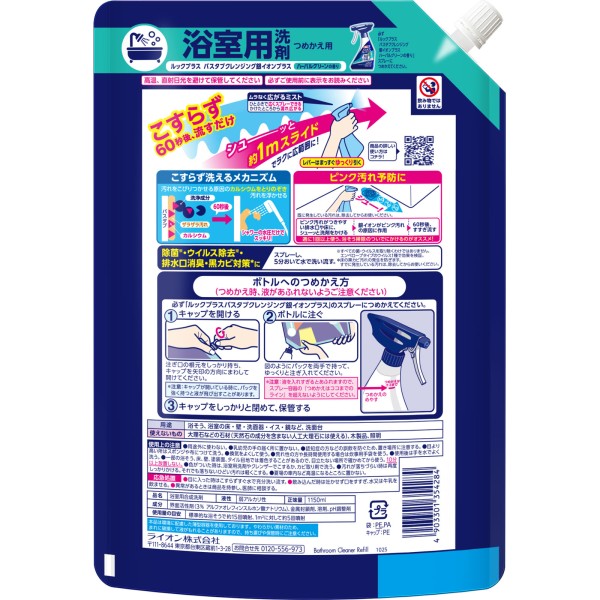 ブルーのミストを浴そう全体にかけて60秒後に流すだけ/「銀イオン」配合/こすらずにピンク汚れの発生を予防できる/ウイルス除去もできるブルーのミストを浴そう全体にシュ-ッとかけて60秒後に流すだけで、こすらず洗える/1プッシュ1m出るバスタブクレンジングに「銀イオン」配合だから、広範囲をこすらずに除菌できる/床や排水口などピンク汚れがつきやすいところに、シューッとかけて60秒後に流すだけで、ピンク汚れの原因微生物を除去。こすらずにピンク汚れの発生を予防できる/ウイルス除去もできる●浴そうをこすらず洗えるバスタブクレンジングに銀イオンを配合。「除菌」と「ピンク汚れ予防」もこすらずにできる浴室用洗剤。