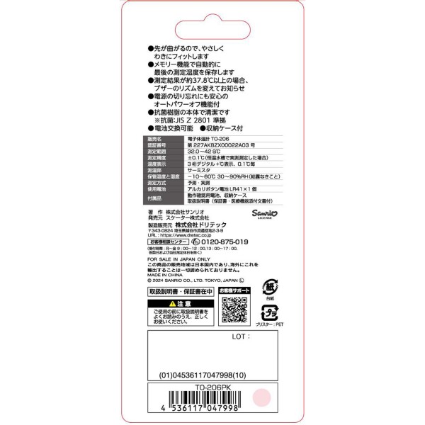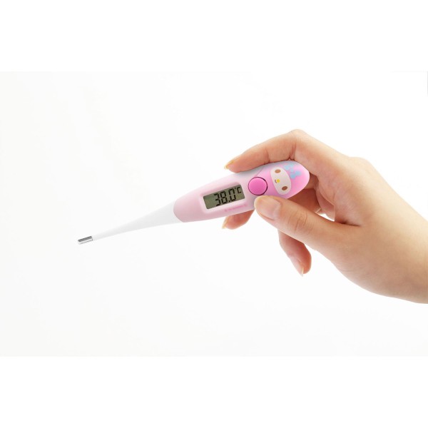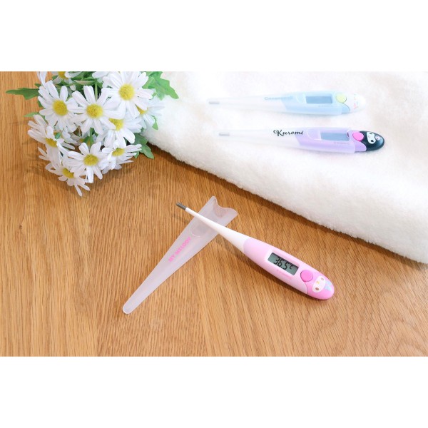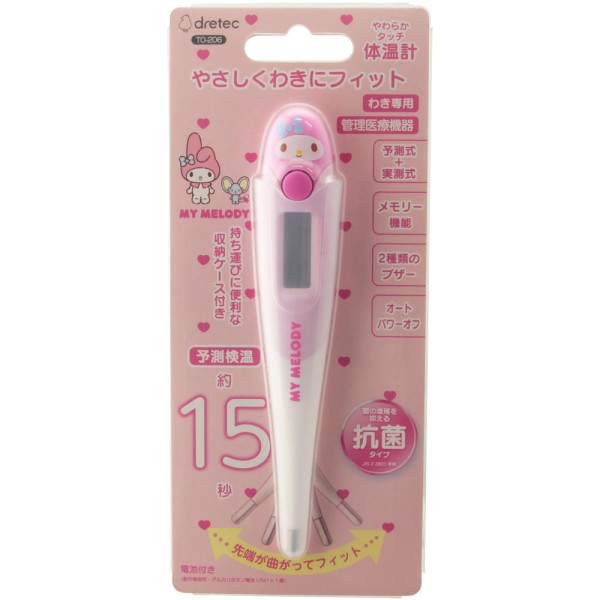 ・サンリオキャラクターのかわいい体温計・わき下約15秒で予測検温/・検温結果が37.8度以上の場合、ブザーのリズムを変えてお知らせ/・先端がまがるのでやさしくわきにフィット/・前回の検温結果を表示するメモリー機能/・抗菌樹脂なので清潔に使用できる/・電源の切り忘れに安心のオートパワーオフ機能 /・電池交換可能/・収納ケース付き