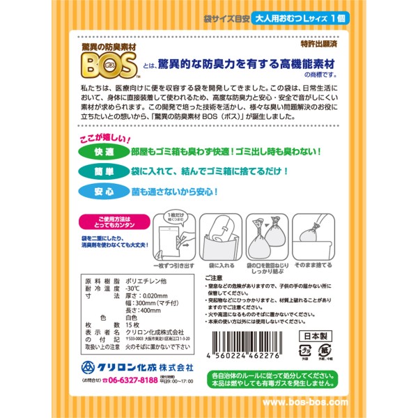 기저귀 냄새 안 나는 봉투 BOS 성인용 L 15매 크리론 화성 > 기저귀 처리 용품