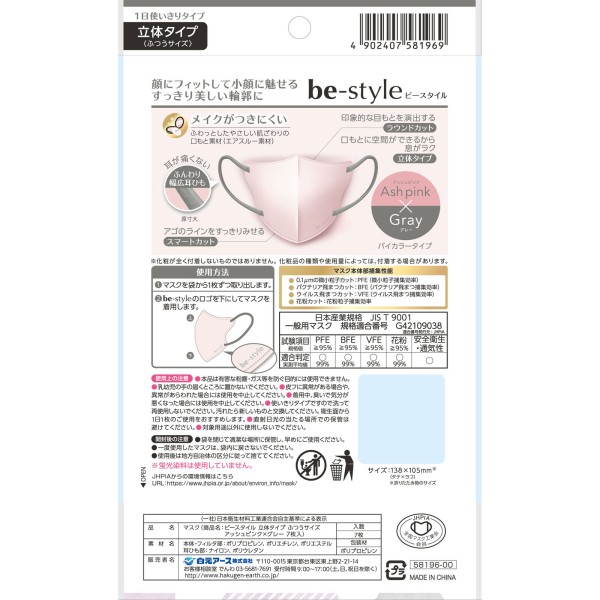 비 스타일 입체 타입 보통 사이즈 애쉬 핑크×그레이 7매 시라모토 아스 > 입체 타입